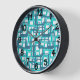 Diese Wanduhr hat ein modernes Design von offenen Rechtecken in blau über offenen Rechtecken in Rotkehlblau.