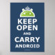 Machen Sie Ihre Aussage über Open-Source-Betriebssysteme, indem Sie Android als Ihr mobiles Betriebssystem Ihrer Wahl wählen. Dieses eindrucksvolle Poster Staaten, "Behalt offen und Carry Android" und enthält das Android Maskottchen in grün über einem blauen Hintergrund. Dies erinnert an die alten Propagandaposter "Keep Calm and Carry On", die von der britischen Regierung 1939 zu Beginn des Zweiten Weltkriegs produziert wurden und die die Moral der britischen Öffentlichkeit im Falle einer Invasion erhöhen sollten.