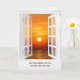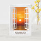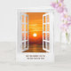 offenes weißes Fenster mit Sonnenaufgang Beileid Karte