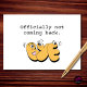 Some exits deserve a proper send-off. “Officially not coming back.” paired with a bold, playful BYE makes this retirement message feel celebratory, confident, and just the right amount of dramatic. The oversized graphic grabs attention instantly while the dry headline delivers the joke with clean simplicity. Perfect for retirement parties, coworker farewells, office send-offs, and anyone who is happily clocking out for good. Blank inside so you can add your own message — heartfelt, hilarious, or slightly unhinged.