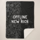 Neben der Phrase "Offline ist der Neue Reiche" steht ein dichtes Bündel geometrischer Gebäude, die einen Kontrast zwischen urbanem und Online-Leben und Einfachheit hervorheben. Rechts steht ein kleines Haus, das von Bäumen und Wolken umgeben ist.