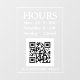 Stunden Open Sign mit QR Code für Speicher-Eingangstür oder Fenster in weißem Text auf transparentem Hintergrund mit QR-Code-Nachricht.