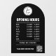 Öffnungszeiten mit QR-Code und Firmenlogo und schwarzer Bogenklammer