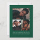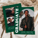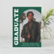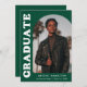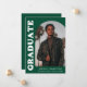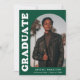 Stilvolle und trendige Ankündigung des Abschlusses mit dem Foto des Absolventen auf der Vorderseite mit einem Offset-Bogen-Foto. "Graduate" wird auf grünem Hintergrund in fett weißem Retrobuchstaben angezeigt. Personalisieren Sie die Titelseite der Ankündigung des Abschlusses des Erzbischofs, indem Sie den Namen, die Schule und den Abschluss des Absolventen hinzufügen. Die Karte kehrt zurück, um weitere 3 Fotos mit Platz für den benutzerdefinierten Text anzuzeigen, wie z.B. künftige Unis, Karrierepläne, Angaben zur Graduierungspartei, etc. Die Ankündigung des grünen Abschlusses ist sowohl für Absolventen der Highschool als auch für Absolventen der Uni ideal.