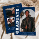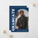 Stilvolle und trendige Ankündigung des Abschlusses mit dem Foto des Absolventen auf der Vorderseite mit einem Offset-Bogen-Foto. "Graduate" wird auf einem marineblauen blauen Hintergrund in fett weißem Retrobuchstaben angezeigt. Personalisieren Sie die Titelseite der Ankündigung des Abschlusses des Erzbischofs, indem Sie den Namen, die Schule und den Abschluss des Absolventen hinzufügen. Die Karte kehrt zurück, um weitere 3 Fotos mit Platz für den benutzerdefinierten Text anzuzeigen, wie z.B. künftige Unis, Karrierepläne, Angaben zur Graduierungspartei, etc. Die Ankündigung des marineblauen Abschlusses ist sowohl für Absolventen der Highschool als auch für Absolventen der Uni ideal.