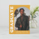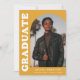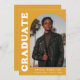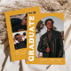 Stilvolle und trendige Ankündigung des Abschlusses mit dem Foto des Absolventen auf der Vorderseite mit einem Offset-Bogen-Foto. "Graduate" wird in fett weißem Retrobuchstaben auf gelb-orangefarbenem Hintergrund angezeigt. Personalisieren Sie die Titelseite der Ankündigung des Abschlusses des Erzbischofs, indem Sie den Namen, die Schule und den Abschluss des Absolventen hinzufügen. Die Karte kehrt zurück, um weitere 3 Fotos mit Platz für den benutzerdefinierten Text anzuzeigen, wie z.B. künftige Unis, Karrierepläne, Angaben zur Graduierungspartei, etc. Die gelb-orange Ankündigung des Abschlusses ist sowohl für Absolventen der Highschool als auch für Absolventen der Uni ideal.