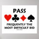 Lassen Sie andere eine doppelte Annahme machen, was häufig das schwierigste Gebot im Bridge-Spiel ist, mit diesem Poster mit den vier Karten-Anzügen zusammen mit dem Sprichwort "Pass Frequently The Most Schwierigt Bid". Gutes Plakatgeschenk für jeden begeisterten Bridge-Spieler oder Bridge-Lehrer!