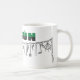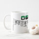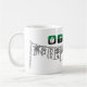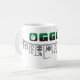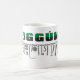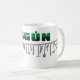 Oggun-Tasse mit achaba. Name von Oggun in Text mit Cowrie-Design. in drei Farben gedruckt; grün, schwarz und grau.