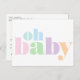 Wenn nicht jeder zusammen sein kann, feiern Sie die Mama-to-be mit einer virtuellen Online-Babydusche. An der Vorderseite dieser minimalen Virtual-Boy-Dusche-Einladung auf der Postkarte steht "oh baby" in einem Regenbogen aus pastellfarbenen aquamarinen, blauen, grünen, rosa, lila und orangefarbenen, trendigen und modernen Typografie. Auf der Rückseite können Sie Ihre Duschdetails ganz einfach personalisieren. Dazu gehören ein Online-Link, Registrierungsinformationen, wo Sie Karten und Geschenke verschicken können und ein Kontakt für weitere Informationen.