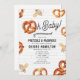 Brezels & Schnuller Babydusche Thema mit Illustration eines weichen Brezels in das Design "oh baby" mit Schnuller- und Brezel-Illustrationen rund um. Hintergrund-Design ist U-Bahn-Fliesen.