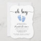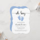 Niedliche Baby Boy Dusche Einladung mit "oh boy" in einem stilvollen Skript mit Wimpern und einer pastellblauen Aquarellfarbe von Babyfüßen.