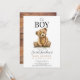 Eine niedliche, rustikale Babydusche mit einem Teddybär in Aquarellfarbe und weißem und braunem Scheunenholz auf der Rückseite der Einladung. Für ein rustikales, modernes Ambiente, mit der Phrase "oh Junge"! Braune und schwarze Typografie.