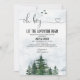 Oh Boy Wildernes Heart Calligraphy Baby Shower Invitation Wilderness thematisierte die Babydusche-Einladung eines Jungen mit einigen Kiefern, Vögeln und einem dekorativen Schriftart mit einem Herz. Ideal für Abenteuer, Winter- oder Wildnisdusche.