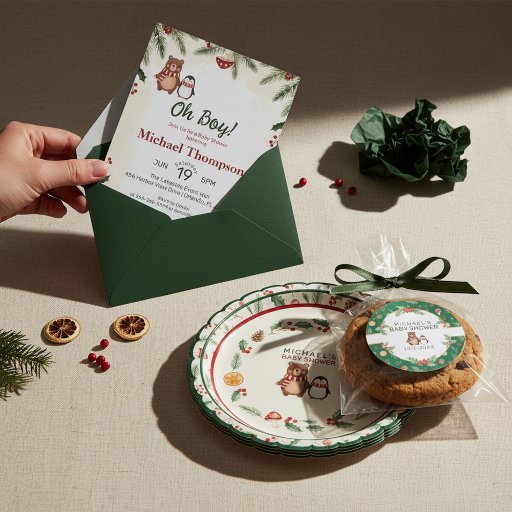 Celebrate a little boy on the way with this charming woodland winter baby shower design. Featuring a sweet bear and penguin, pine greenery, holly, and whimsical forest details, this artwork blends cozy winter vibes with a soft, neutral palette. The rustic illustration style and playful “Oh Boy” typography create a warm, festive look perfect for a nature-inspired or winter-themed baby shower.