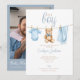 Diese süße Babyparty-Einladung zeigt eine hübsche blaue Babykleidungswäscheleine und kann mit Ihren Details in stilvoller Typografie personalisiert werden. Die Rückseite enthält Ihr besonderes Foto und einen QR-Code für die Geschenkeliste. Entworfen von Thisisnotme©