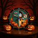 Diese seltsame, kreisförmige Abbildung zeigt einen traurigen Geist in einem karierten Schal, der eine aquamarine Tür öffnet, mit den Worten "OH NO" darüber. Auf einem Schild rechts steht: "NICHT WIEDER." Die Szene ist Set mit Kürbissen und Herbstblättern, was der Kunst ein humorvolles, Halloween-Thema und widerstrebend einladendes Ambiente verleiht.