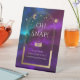 Oh Snap Cosmic Lila Aquamarinen Gold Sun Moon Astronomie Weltraum Hochzeitsfeier Pedestal Sign bietet Goldsonne, Mond und Sterne mit einem goldenen Rahmen auf einem farbenprächtigen mystischen lila, aquamarinen und blauen kosmischen Hintergrund. Im Inneren ist Ihr eigener Text. Für Sie entworfen von Evco Studio www.zazzle.com/store/evcostudio
