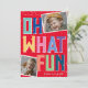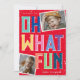 Helle, lustige und farbenfrohe Weihnachtskarte! Design hat einen traditionellen roten Hintergrund mit farbigen Buchstaben, die - Oh, was Spaß! Zwei Fotos Ihrer Wahl, Familienname, Datum und fröhliche Weihnachtswünsche. Das gesamte Design ist mit einem Schneeüberlagerungsstück bedeckt, das eine festliche Winterstimmung verleiht.