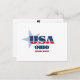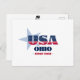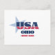 Ohio Postkarte. Ein kreatives Typografie-Design, das Ohios Essenz mit kühnen Rot-, Weiß- und Blautönen und patriotischen Elementen, einschließlich US Flagge, verkörpert.
