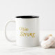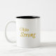 Die "Ohio Strong" Zwei-Tone-Kaffee-Tasse verkörpert zeitgenössische Design-Trends und feiert gleichzeitig die Widerstandskraft und den Geist von Ohio. Diese Tasse, die mit einem scharfen Blick für moderne Ästhetik gestaltet wurde, verbindet die minimalistische Eleganz nahtlos mit einer wirkungsvollen Botschaft. An der Vorderseite der Tasse wird die fett-stylische Typografie gezeigt, die "Ohio Strong" in goldenen Buchstaben ausdrückt. Der Einsatz von Goldakzenten verleiht der Tasse eine Touch von Luxus und Prestige, was die visuelle Anziehungskraft erhöht und eine kraftvolle Aussage macht. Die Wahl des Schriftartes spiegelt moderne Designsensibilitäten wider, mit schlanken Sans-Serif-Figuren, die ein Gefühl von Stärke und Widerstandskraft vermitteln.