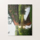 Eine friedliche Szene einer roten bedeckten Brücke und sie ist Reflexion im Strom unten.