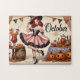Retro Button-Up Girl Jigsaw Puzzle, Vintage Halloween Art, Festivals Fall Puzzle Dieses Bild zeigt ein bezauberndes Button-Up Mädchen, das als Hexe verkleidet ist und spielerisch inmitten einer festlichen Halloween-Umgebung mit Kürbissen, Tränken und saisonalen Dekorationen posiert. Ihr bezauberndes Lächeln und ihre elegante Kleidung erwecken den Spaß und die Magie des Oktober, der einen Vintagen Halloween-Geist mit nostalgischem Flair hervorruft.