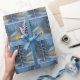 A white quaint church, with its illuminated windows, stands in stark contrast to the cool, snowy forest landscape surrounding it