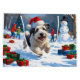 Ein flauschiger Old English Sheepdog läuft glücklich durch den Schnee und trägt einen hellen roten Weihnachtshut. Die spielerische Winterszene zeigt den schattigen Mantel der Rasse, die sanfte Natur und den fröhlichen Geist, während sie den festlichen Zauber der Urlaubssaison einfängt. Ein charmantes Design voller Wärme und Fröhlichkeit.