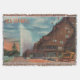 Auf einer Decke mit einem Vintage-Bild von Old Faithful Gigers im Yellowstone Nationalpark und der historischen Lodge.