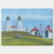 Gurnet Light, auch bekannt als Plymouth Light, ist das älteste stehende Holzlichtmuseum in den Vereinigten Staaten. Dieses Bild zeigt, wie der Leuchtturm und seine Leuchttürme vor 1924 aussahen, als der Nordost-Turm abgerissen wurde, mit einem blauen Himmel, sanften Grüntönen eines grasbedeckten Hügels und lebhaften Rottönen der Dächer der Stützen. Die Leuchttürme überblicken die Plymouth Bay in Plymouth, Massachusetts, sind aber derzeit nur über das benachbarte Duxbury zu erreichen.