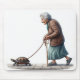 Eine ältere Frau mit lockig grauem Haar, die einen langen Rock und einen braunen Cardigan trägt, läuft auf einem gepflasterten Pfad eine Schildkröte