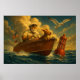 An old sailor and his trusty canine companion sailing choppy waters on their motor boat, this painting is fun colourful and exudes a feeling of movement and adventure