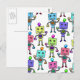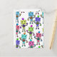 mit einer digitalen Illustration einer Vielzahl von mehrfarbigen alten Robotern. Jede hat eine Glühbirne auf dem Kopf und viele Knöpfe, die in ihre Brust eingebaut sind.