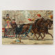 Victorian sisters riding in a horse sleigh with a dog running besides them in the snow. Nostalgic vintage christmas illustration by Mary Evans.