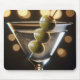 Ein klares Martini-Glas hält einen mit drei grünen Oliven geschmückten Cocktail auf einem Set mit Spieß vor einem warmen Licht.