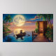 Dieses atemberaubende Ölgemälde bringt Sie in ein ruhiges tropisches Paradies, wo ein massiver Mond ein goldenes Licht über ruhiges Wasser wirft. Eine geheimnisvolle Gestalt reiht ein Boot zum Betrachter, während Palmen in der Brise stehen. Ein Holzsteg und ein einladender Saal mit warmer Beleuchtung verleihen der Szene eine kinematische und ruhige Schönheit.