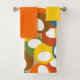 Dieses Set ist mit einem gelben Waschlappen, einem orangefarbenen Handtuch und einem Badehandtuch mit einem modernen, blauen, grünen, braunen, sienna, gelben und orangefarbenen Kreissymbol aus der Mitte des Jahrhunderts ausgestattet.