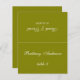 Eine einfache, olivgrüne Hochzeitsfeier mit dem Namen des Gastes und der Tischnummer, die auf der Vorderseite gedruckt ist, die Braut- und Bräutigamen und das auf der anderen Seite ausgedruckte Hochzeitsdatum (d.h. die andere Hälfte, bevor es zusammenfällt). Der gesamte Text ist weiß. Größe: 4,5" x 5,6" vor dem Falten, das sind 4,5" x 2,8" nach dem Falten.