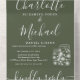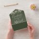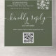 Alles in einer Hochzeitseinladung mit hübschen Saitenlichtern, Mauerkirschen, prächtigen Stilbezeichnungen und schicken Typografien auf einem olivengrünen Hintergrund. Die Einladung enthält eine perforierte RSVP-Karte mit QR-Code. Entwickelt von Thisisnotme©