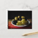 Auf dieser Postkarte finden Sie ein köstliches Sortiment an Oliven wie Picholine, Nicoise, Kalamata, grüner Cerignola und schwarzer Cerignola. Sie sind in einer weißen Schale auf einer bunten, gewebten roten, gelben und grünen Matte auf einem schwarzen Hintergrund angeordnet, um eine künstlerische und mündige noch lebendige Komposition zu erhalten.
