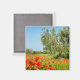 Souvenir Foto Magnet mit einem alten Olivenbaum in einem Mohnfeld voll von pulsierenden roten Mohn in einer Landschaft in der Toskana, Italien.
