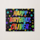 Dieses lustige, aufregende, zum Geburtstag kommende Puzzle-Design enthält die Nachricht "HAPPY BIRTHDAY, OLIVER" mit den Buchstaben, die ein farbenprächtiges Regenbogenspektrum haben, inspiriertes Farbverlaufsmuster und ein lebendiges Sternenhintergrundmuster. Ein farbenfrohes Rätsel wie dieses könnte eine lustige Art sein, Geburtstagswünsche an jemanden namens Oliver zu senden. [~Z0000468]