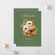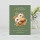 Dieses Modell der Schwangerschaftsankündigung hat ein charmantes fallförmiges Design, das perfekt für Herbstankündigungen geeignet ist. Der Hintergrund ist ein warmes Olivgrün, während der Text mit eleganter Schriftzeichen-Kalligraphie in einem weichen goldgelben. In der Mitte sorgt ein Arrangement aus Herbstelementen wie lebhaften Orangenkürbissen, weißen Blume und einem reichhaltigen Blattwerk in Orange- und Goldtönen für eine gemütliche saisonale Ästhetik. Die Überschrift lautet "Wir erwarten einen kleinen Kürbis", gefolgt von den Einzelheiten der Ankündigung. Der unten stehende Text enthält Platz für die Personalisierung des Fälligkeitsdatums und der Namen der künftigen Eltern. Diese Vorlage ist ideal für alle, die eine süße und festliche Möglichkeit suchen, ihre Babynachrichten während der Herbstsaison zu teilen.