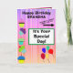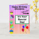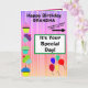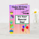 Happy Birthday GRANDMA ist in schwarzer Typografie gegen lila, rosa, orange, gelbe Ober Streifen Farben geschrieben. Bunte Ballons und Vanille und Schokolade dekorierte Kuchen mit Kirschen und Kerzen. Es ist Ihr besonderer Tag ist geschrieben gegen weiß und hellbeige grünen geometrischen Rechteck. Inside links hat Geburtstag wünscht GRANDMA in rosa und rot Typografie und fliegenden Ballons. Im Inneren rechts befindet sich ein gerahmter Bereich in Rosa und Schwarz mit einem schlauen grünen Hintergrund, in dem Kinder ihre kleine Nachricht handschreiben oder einen zeichn machen können. Original Artwork and Design © TamiraZDesign.