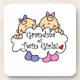 Zwei bezaubernde Babys in einem Lavendel und rosa Schläfer und Text, der "Oma der Zwillingsmädchen" auf der neuen Oma von Zwillingsmädchen mit Sake-Boxen, Fliesen, Ziergegenständen, Tasse, Magneten, Karten, Aufklebern, Totensäcken und anderen Großmutter-Bekleidung und Geschenken liest.