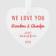 Niedliches Weihnachtsgeschenk für Oma und Opa. Auf der Vorderseite füllt Ihr Bild einen herzförmigen Rahmen. Auf der Rückseite können Sie den Ausdruck "I Liebe You" oder "We Liebe You" personalisieren und personalisieren, ob sie "Oma & Opa", "Nana & Papa", "Mommom & Poppop" usw. heißen. Sie können auch die Namen und das Jahr der Enkelkinder oder Enkel hinzufügen, alle in roter Typografie vor weißem Hintergrund.
