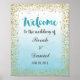 Plakatdruck für Begrüßungsschild mit Imitaten goldenes Glitzer-Design und farbenfrohen Aquarellfarben.