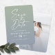 Ombre Dusty Blue & Green mit Skript-Foto Hochzeit speichern Sie die Datumskarten. Dieses moderne und dennoch klassische Design ist minimalistisch und elegant mit einem hübsch verblassenden Farbverlauf und einem wunderschönen Schriftzeichen-Text für Kalligraphie. In der neuen Farbpalette gezeigt. Auf der Rückseite des Hauses befindet sich auch ein optionales Foto des Ehepaares. Oder verstecken Sie einfach die Ebene, um einen soliden Hintergrund zu haben. Um mehr zu sehen, suchen Sie nach Chic Paperie's Hochzeitskollektionen 2022, um alle über Trend Designs und Hochzeitsfarben für dieses Jahr zu sehen.