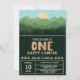 Celebrate your little explorer with this Modern Minimalist One Happy Camper 1st Birthday Invitation. Perfect for a mountain or forest themed adventure, this design features a retro vintage aesthetic with rustic woodland green trees and a campsite sunset.
