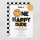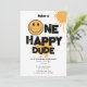 A cute happy birthday invitation design. A cute "One happy dude" happy themed first birthday party invitation. A happy dude themed birthday invitation that can be customized to your details.